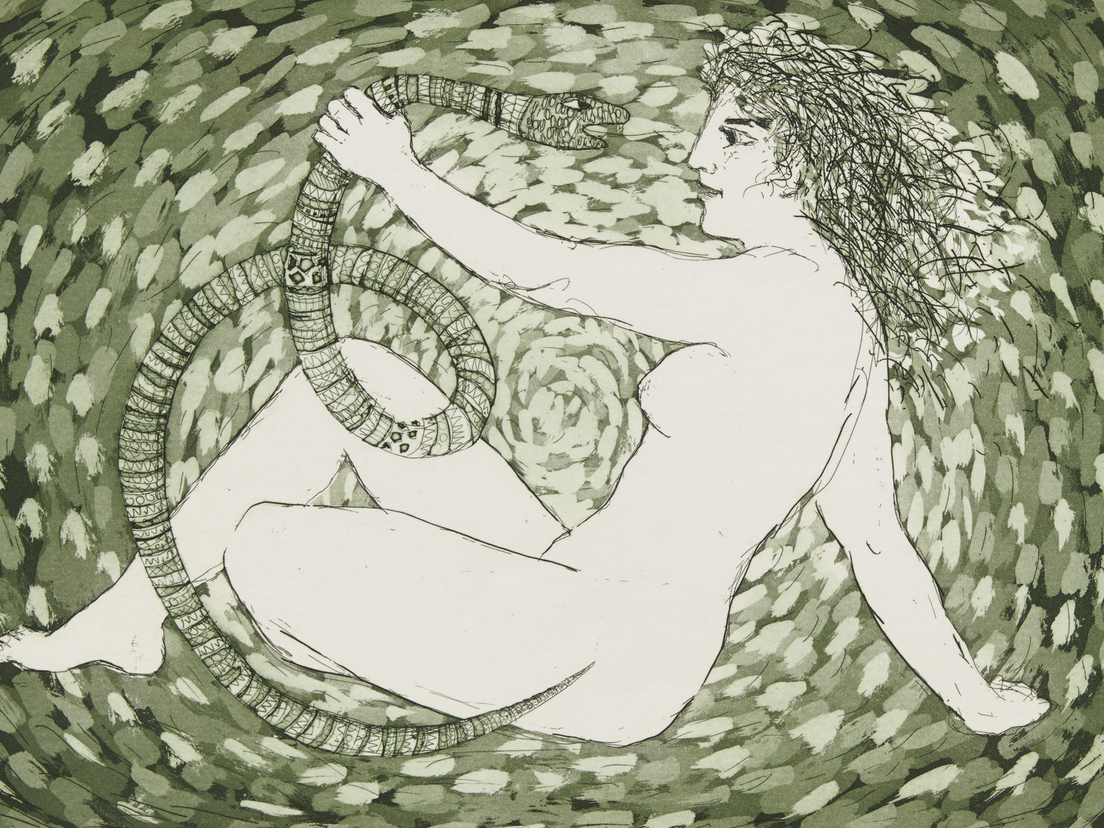 "A goddess confronts patriarchy: she is naked and magnificent; he a great serpent, phallic, coiled, bejewelled. She looks apt to bite."