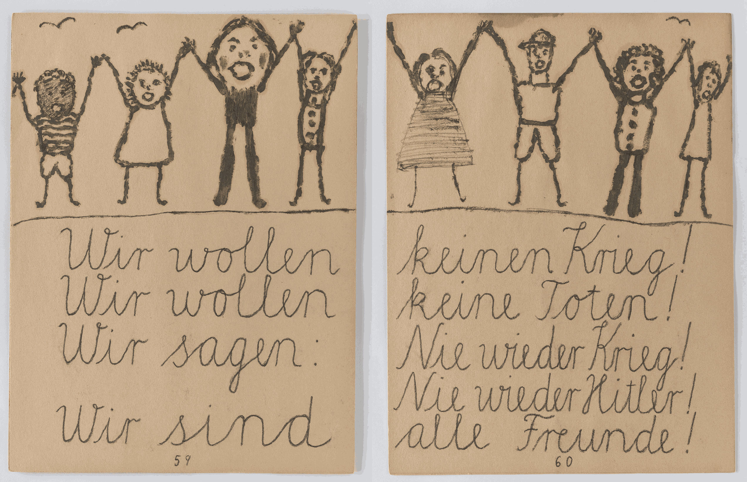 However, the book ends on a positive note, showing the liberation of prisoners from the concentration camps, Jewish children returning to their regular activities, and a final, cheerful salute that reads: "No More War! No more Hitler! We are all friends!”